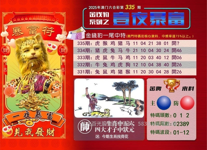 | 335期⑤肖 | 虎牛狗羊鸡 | 开:狗44中 |